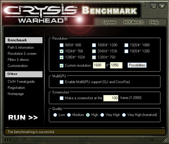 なお,もし何らかの事情でテスト中に異常終了した場合は,Crysis Warhead Benchmarkの設定から,当該解像度だけを選択してやり直せば大丈夫だ。