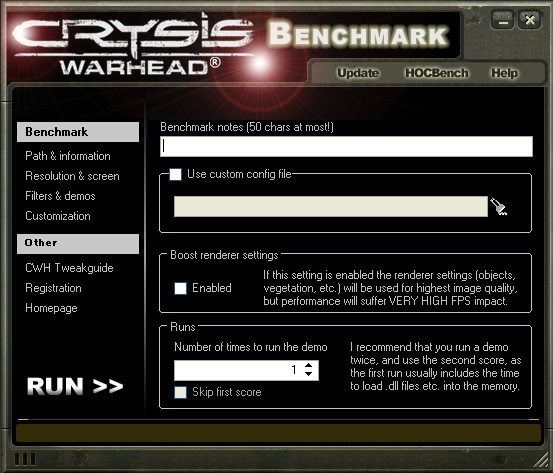 ミドルクラス以上のGPUを想定した設定にせよエントリー設定にせよ,ここまで来ればあとは簡単。Crysis Warhead Benchmarkのウインドウ左下に用意された[RUN>>]ボタンを押すだけである。途中で解像度設定などを切り替える必要はなく,自動的にテストが進んでいく。