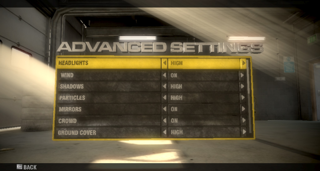 グラフィックス関連の設定は,すべて設定できる限り最高のものを選んでいる。「OPTIONS−GRAPHICS SETTINGS−SCREEN SETUP−ADVANCED SETTING」は,キーボードの[Shift]キーを押すことで呼び出せるが,実際にプレイしてリプレイを取得することも考えると,「Microsoft Xbox 360 Controller for Windows」を用意して,[Y]ボタンを押すほうが便利かもしれない。