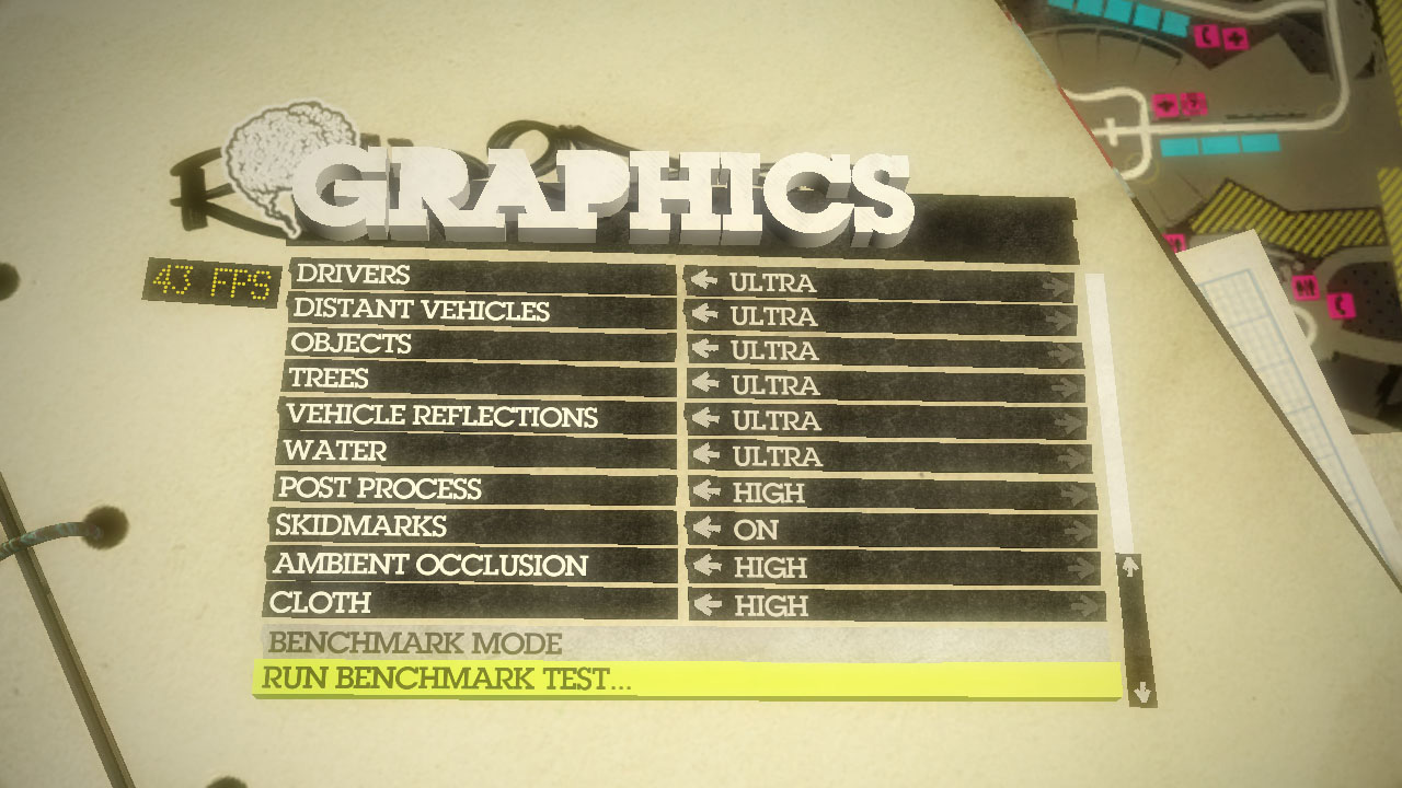 さて,そんなDiRT 2では,ゲーム側にベンチマークモードが用意されている。DiRT 2のUIは,ゲーム画面と一体化しており,少々分かりづらいが,モーターホームから「OUTSIDE」→「OPTION」→「GRAPHICS」と進み,メニューを一番下までスクロールすれば選択できるので,慣れればどうということはないだろう。