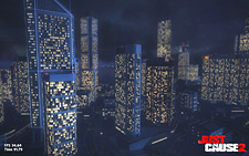 いずれも,シーン内をカメラが飛び回る,いわゆるFlybyというシークエンスが用意されるが,今回は以上の3つから,めまぐるしい勢いで時間が経過して,太陽光やビルの証明など様相が変化するうえ,ビルの窓ガラスにも背景が映り込むなど,最も負荷の高いConcrete Jungleを使うことにした。