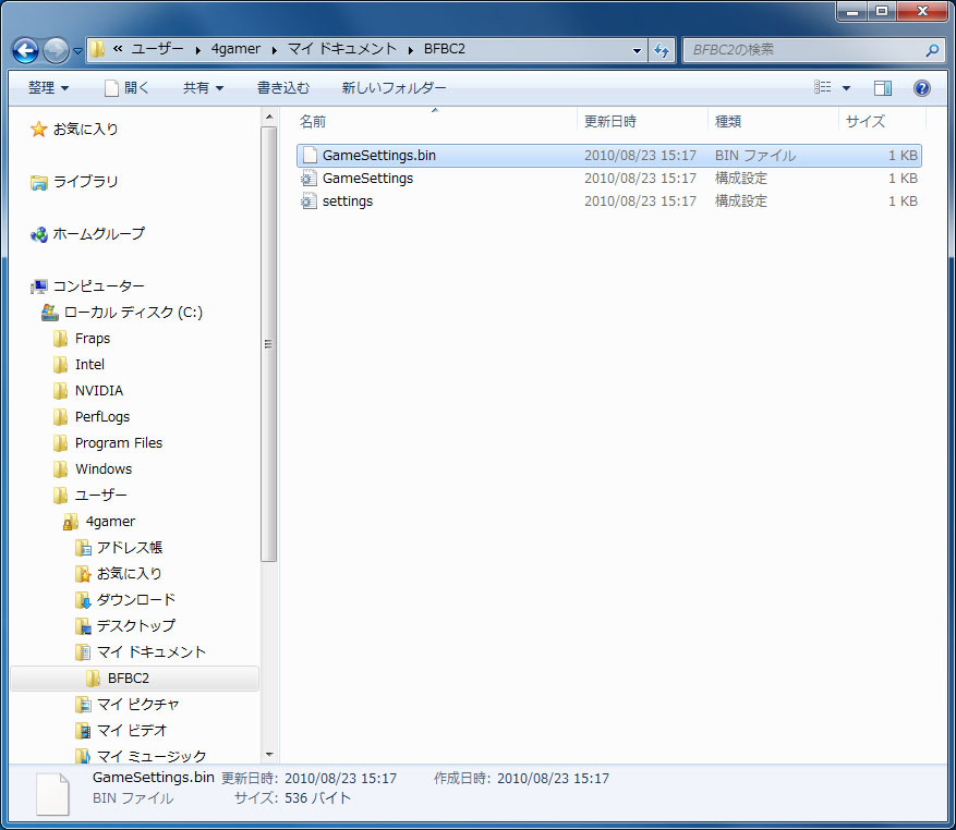 セーブデータの保存先:C:\Documents and Settings\【ユーザー名】\BFBC2\GameSettings.bin