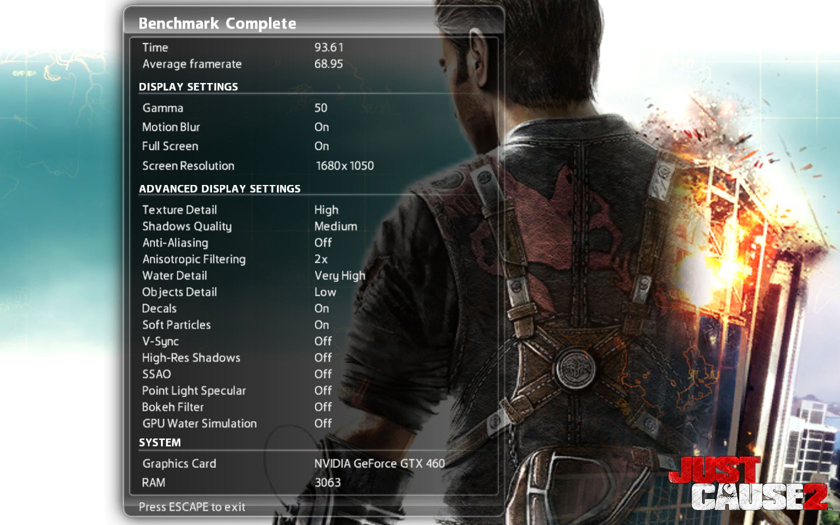 これは,Just Cause 2の描画負荷がかなり高く,描画オプション設定を高くしてしまうとスコアが大きく下がってしまい,グラフィックスカードのパフォーマンス比較に適さなくなるためである。