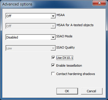 設定のポイントは,グラフィックス設定のプリセットを最高の「Ultra」に指定しつつ,「Render」で「Enhan. full dyn. lighting(DX11)」を明示し,DirectX 11モードを有効にしていること。また,「Advanced option」では,DirectX 11世代のGPUが持つ機能を最大限利用すべく,DirectX 10.1やテッセレーションを利用するためのチェックボックスを有効化している。