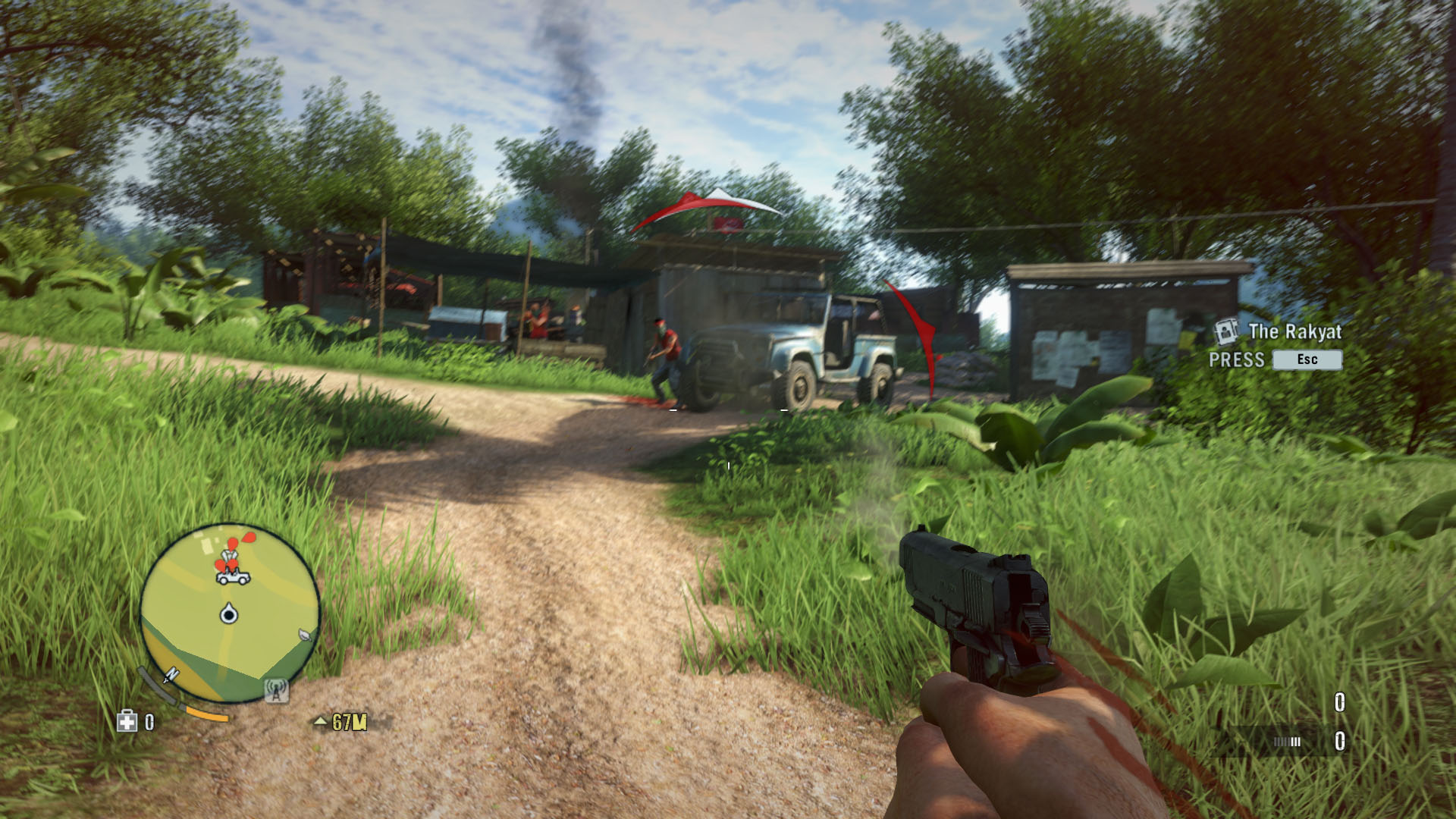 さて,テストをどのように行うか。Far Cry 3にはベンチマークモードが用意されていないため,実際のゲームシーンを用いることとなる。そこで選んだのが,序盤の,電波塔を修理し,狩りを行った後,「SECURE THE OUTPOST」のミッションでDennisが運転するクルマ車に同乗し,移動するシーンだ。このシーンでは,クルマが毎回同じルートを通って移動するため,「プレイヤーの操作」という最大の不確定要素を排除することができる。