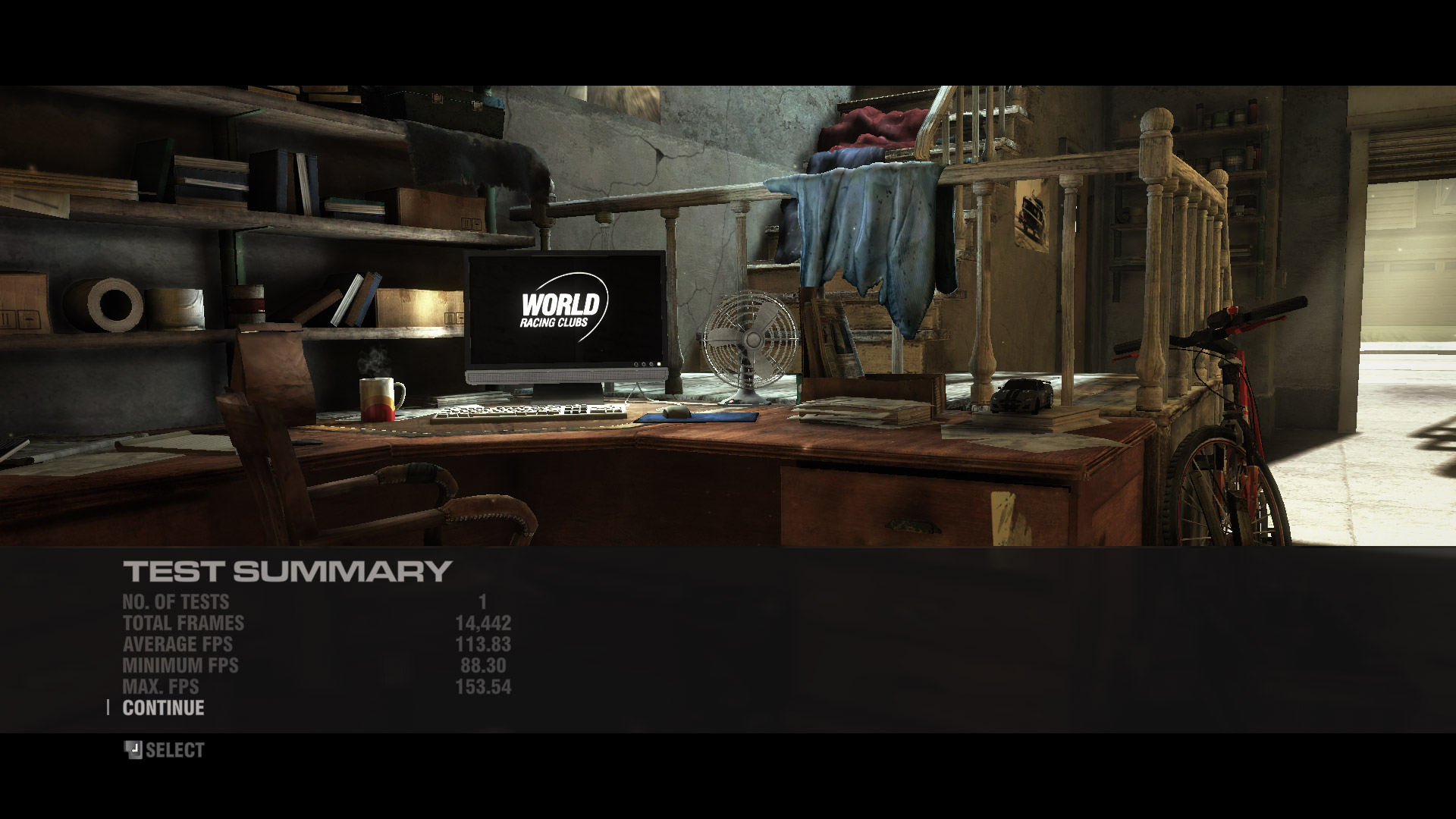 ベンチマークツールに登場する競技車両の動きはAIによって制御されており,そのため,スコアには若干の変動がある。ただし,条件を変えながら行った事前検証だと,バラツキは一定の範囲内に収まっていたため,テストは解像度ごとに2回連続で実行し,その平均をスコアとして採用することにした。