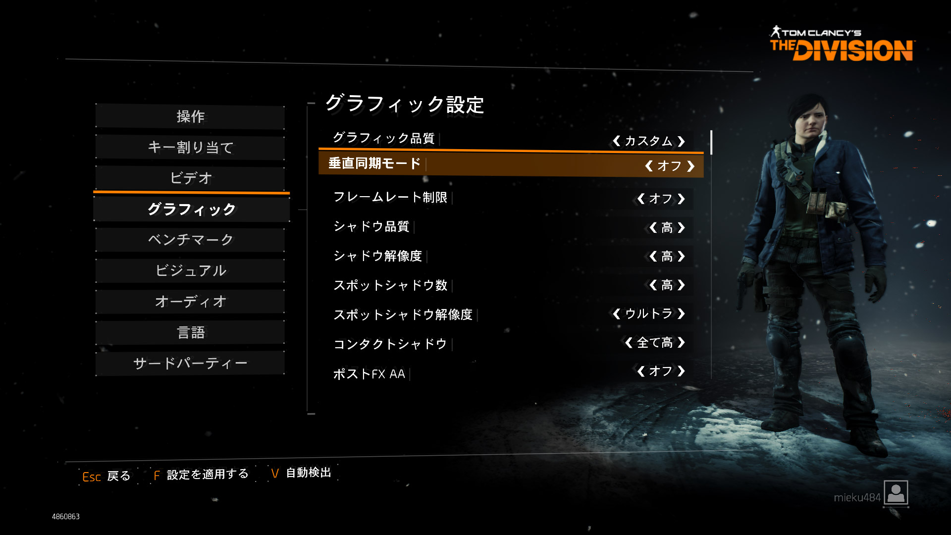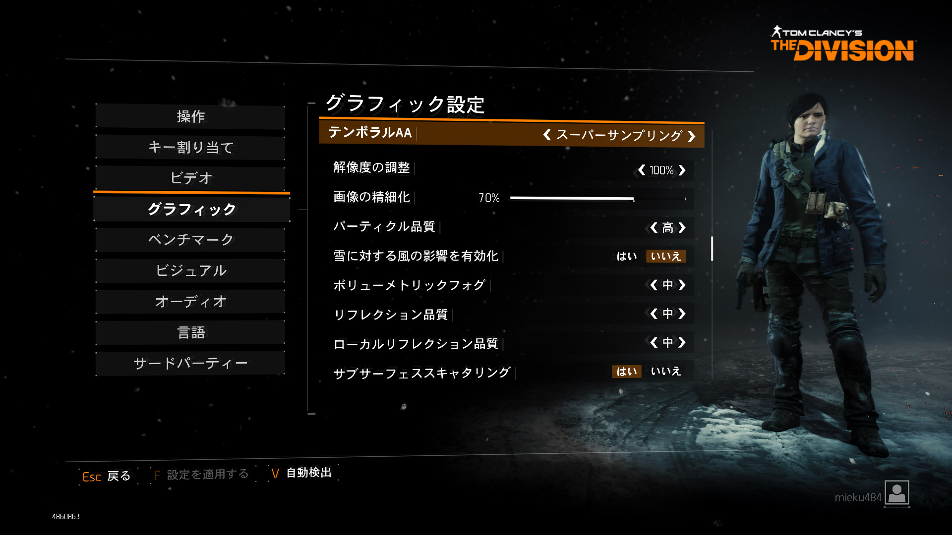- (10)(3)以降を,グラフィック設定プリセットと解像度を変更しながら繰り返す
