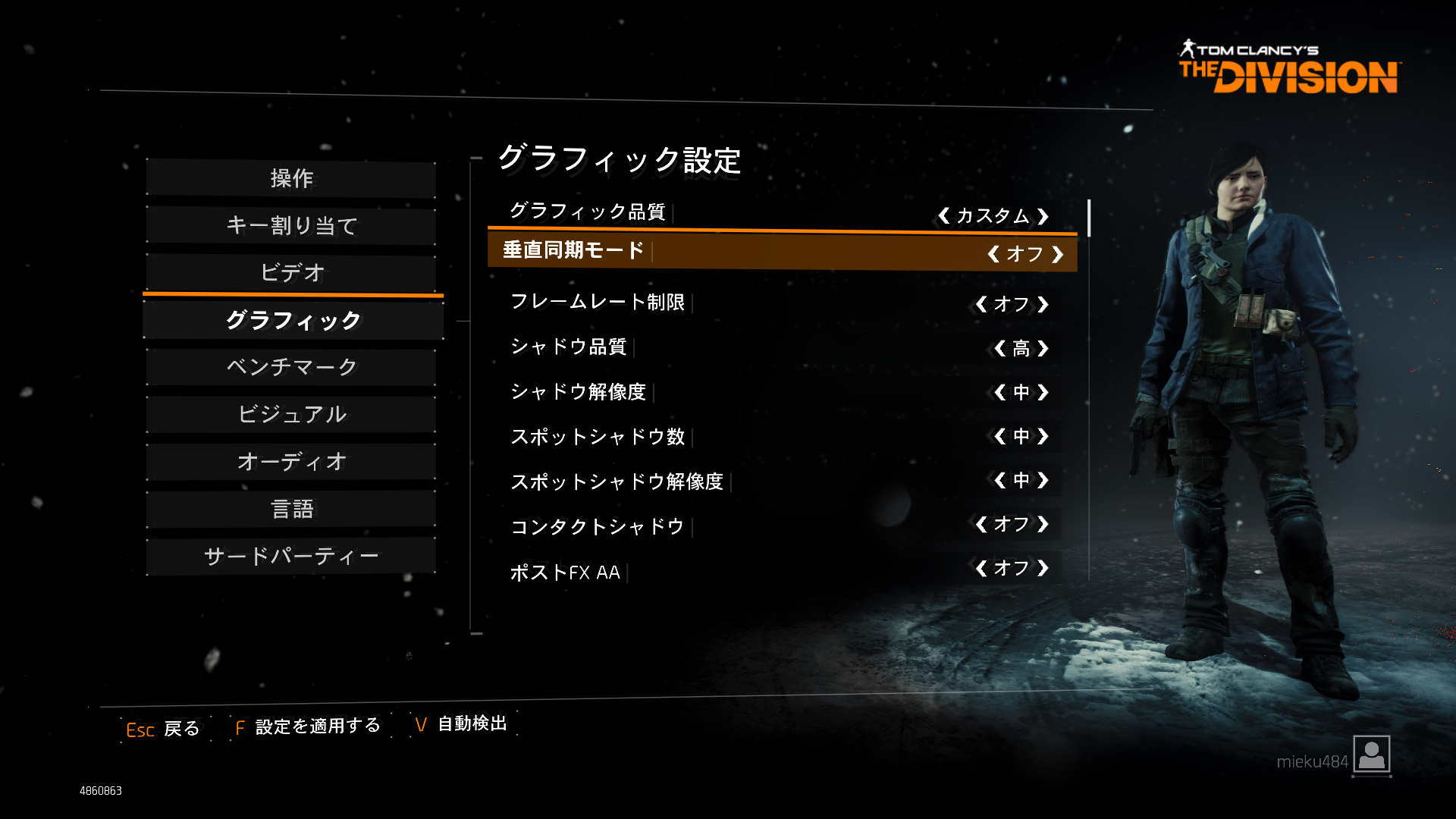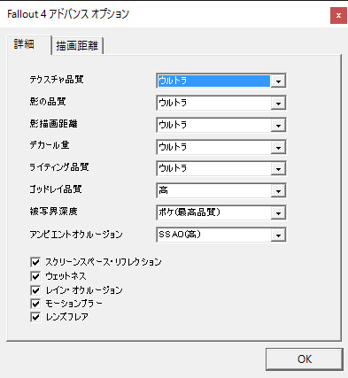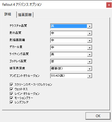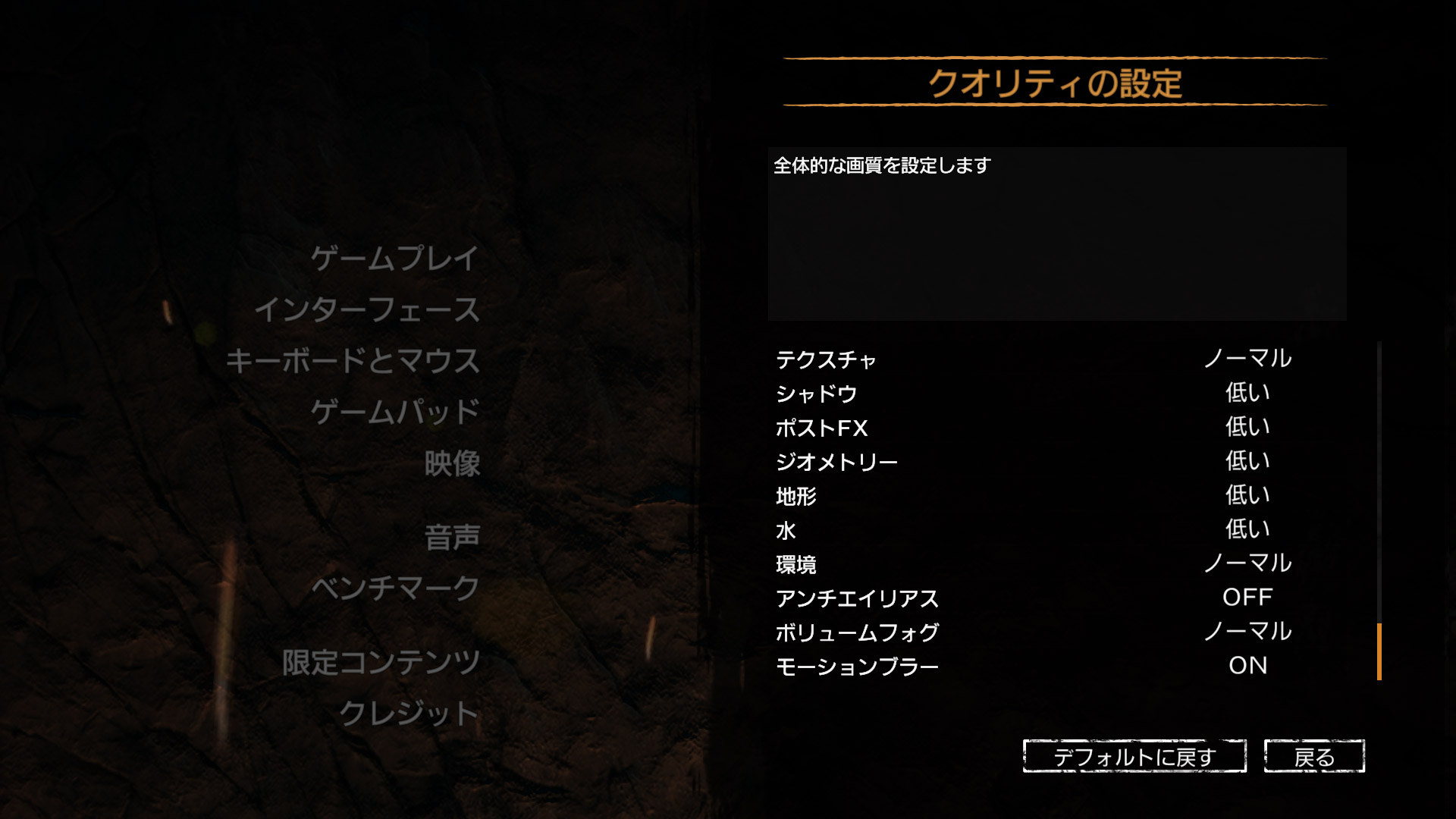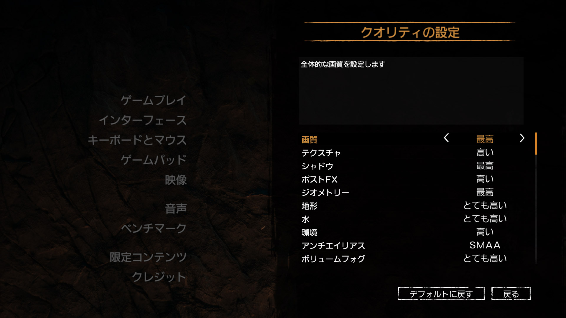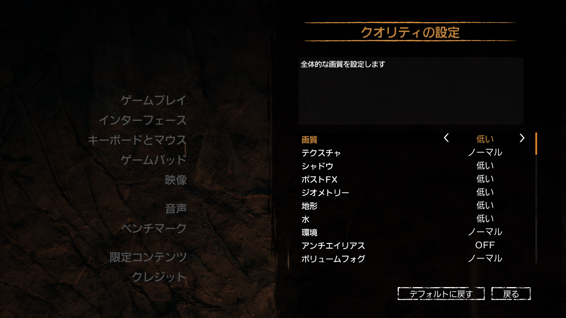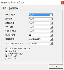 ゲーム設定:「オプション」−「映像」−「クオリティの設定」