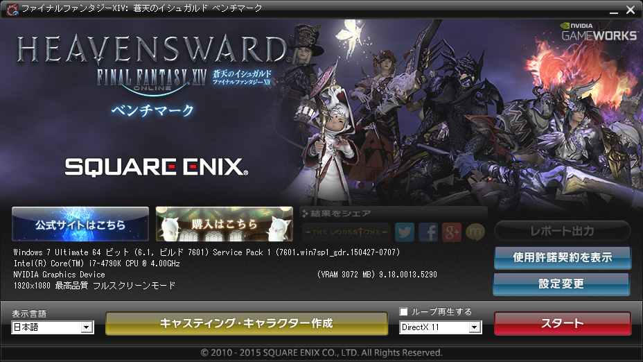 テスト方法は,新生FFXIVベンチ キャラ編と同じく,実行するだけ。ただし,ベンチマークシークエンスが約8分30秒と長く,それもあってスコアに大きなブレが出にくいことから,テストは1回のみの実行とし,その結果として表示される整数値のスコアをそのまま採用する。