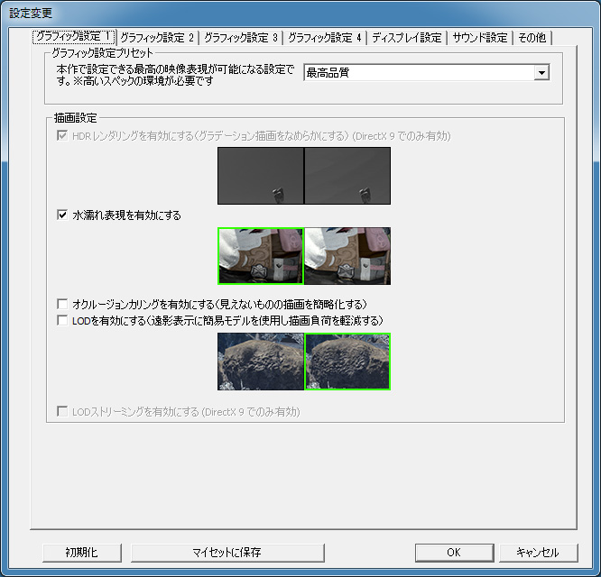 - (4)「グラフィック設定1」タブのグラフィック設定プリセットを適宜選択する
