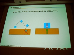 ゲームにおける物理について改めて説明するまでもないとは思うが,簡単にまとめてしまえばゲーム中に登場するオブジェクト(物体)の動きを物理計算を使って表現することで,より現実に近い動きを表現しようというモノだ。使用される計算はニュートン物理に代表される古典物理のレベルで「物理といってもたいして難しいものではない」(櫻井氏)。