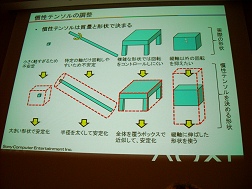 慣性テンソルは物体の形状や重量配分から決めることができるが,物理エンジンでは「慣性テンソルが小さくなりすぎると物体の動きが安定しない」(松生氏)のだという。そのため,物体の形状から想定される慣性テンソルをそのまま使ってしまうとオブジェクトの動きが安定しない結果になりやすいそうだ。