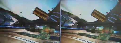 具体的に立体視の映像を出力するには,720Pの映像(1080Pは無理なので)の場合,2枚の絵がつながった1280×1470ドットの絵を作って出力する感じになる。720Pの絵が2枚縦につながった状態だ。上にあるほうが左目用で下にあるのが右目用の画像で,間は30ピクセル分のギャップを付けておく。これを規定のフォーマットで表示すれば,テレビの側で立体視表示してくれる。