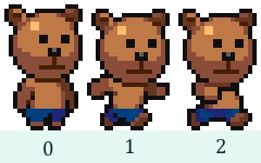 スプライトのアニメーションは,Spriteオブジェクトのframe変数を変更することで実現できます。bear.gifの場合,60×30ドットの画像ですが,スプライトの大きさは20×30ドットで指定されており,実はこのスプライトの大きさの絵が,左から順に0(中央),1(右足前),2番(左足前)のframeに自動的に格納されていますので,それを呼び出してやります。今回はなにも考えず,フレームごとに,