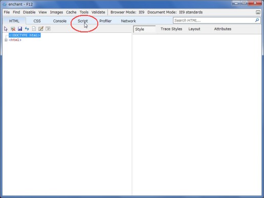 IE9の場合,F12キーを押すと開発者ツールが起動します。デバッグしたいページを開いた状態でF12を押してください。開発者ツールが起動した時点で,F5キーで再読み込みをしてやれば,(問題が発生している場合)エラーメッセージなどを表示してくれます。