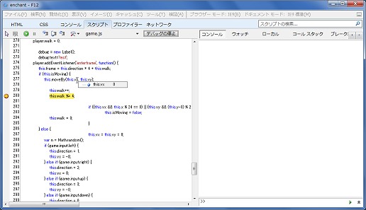 本筋からは外れますが,PC用のブラウザでenchant.jsを使ったページを開くと,スクロールバーが出てしまい,カーソルキーの操作と同期して全体がスクロールしてしまうことがあります。Webブラウザウィンドウをちょっと小さめにしてF5で再表示したのちに大きさを戻すなどすれば大丈夫なのですが,ちょっと煩雑です。そこで,enchant.jsの画面サイズ設定部を書き換えて画面よりクライアント領域を少し小さめにしています。ブラウザごとに調整値は変わってきそうですが,ここではとりあえず,縦横20ピクセル小さめに設定するようにしてあります。その結果,ゲーム画面自体が右と下が20ドットほど削られたようで,ゲームにも多少影響が出ますが,とくに対処はしておりません。