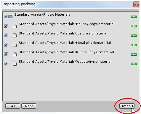 どんな物理的挙動をさせるかというのは「Physic Material」というもので指定するのですが,どう指定すればいいか見当もつかないでしょうから,参考になるものを見てみます。Assetsメニューから[Import Package]-[Physic Materials]を選択し,すべて読み込んでください。