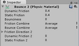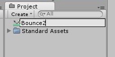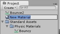 ここでPhysic Materialsをインポートしてきたときに,Projectビューに[Standard Assets]-[Physic Materials]というのが追加されているのが確認できると思います。ここに物理動作の素材がいくつか用意されていますので,それを参考にしつつ,今回は新しい素材を作ってみます。よく跳ねるのは「Bouncy」という奴ですが,跳ねすぎなきらいもあるのでやや弱めにしてみます。