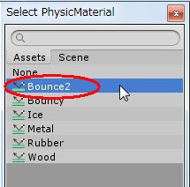 Materialの項の右端に小さな「○」印が付いているのが見えますね(実際は真ん中に点がある○です)。この「○」印は,Unity Editorで選択ウィンドウを開くためのボタンになっています。押すとPhysic Materialsの一覧が出てきますので,先ほど作成した「Bounce2」をダブルクリックで選択してください。