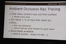 現在のゲームでもアンビエントオクルージョンによる遮蔽の陰影などは,レイトレース(的なもの)を使って高品質な結果を得られるようになってきているが,そういった路線の延長上で,進んでいくというのが氏の読みだ。まあ,どちらかというと「将来のレンダリングシステム」ではなく,「PCにおける現状の最先端レンダリングシステム」ではないかという気もしなくはないのだが。