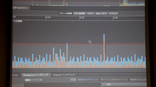 単位時間ごとの性能グラフでは,棒グラフの各部が塗り分けられているので,時間がかかっているのがActionScriptの実行なのか,描画なのか,それ以外なのかといった切り分けを簡単にできることが分かる。さらに,時間がかかっている処理の内訳を関数単位まで切り分けて調べることもできる。また,ドローコールごとに1ステップずつ描画したりといった操作で描画の不具合を細かく確認できるなど,Flash上での3Dゲーム開発までも支援するツールとなっている。