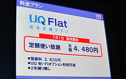 発表会では,UQCの田中孝司代表取締役社長が,新たなサービスを発表。1か月定額4480円(税込)で,一部新幹線の車内や空港などで利用可能な「UQ Wi-Fi」も使い放題となる