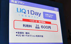 - UQ 1 Day:600円で,24時間使い放題。10月1日サービス開始予定