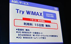 - Try WiMAX:15日間無料で,UQ WiMAX(≒UQ Flat)の15日間無料体験。UQ WiMAXデータ通信カードなどの接続端末も無料で貸し出される。7月1日開始予定で,受付はUQ WiMAX公式Webサイトにて