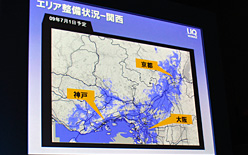 | 左は京阪神圏の7月1日時点におけるサービスエリア(予定)。カバー率は明らかに低い。田中氏は,そんな状況も踏まえつつ,新幹線のN700系車内や都営地下鉄の駅,主要空港において無料で使える無線LANサービス,UQ Wi-Fiもアピールしていた(右) |