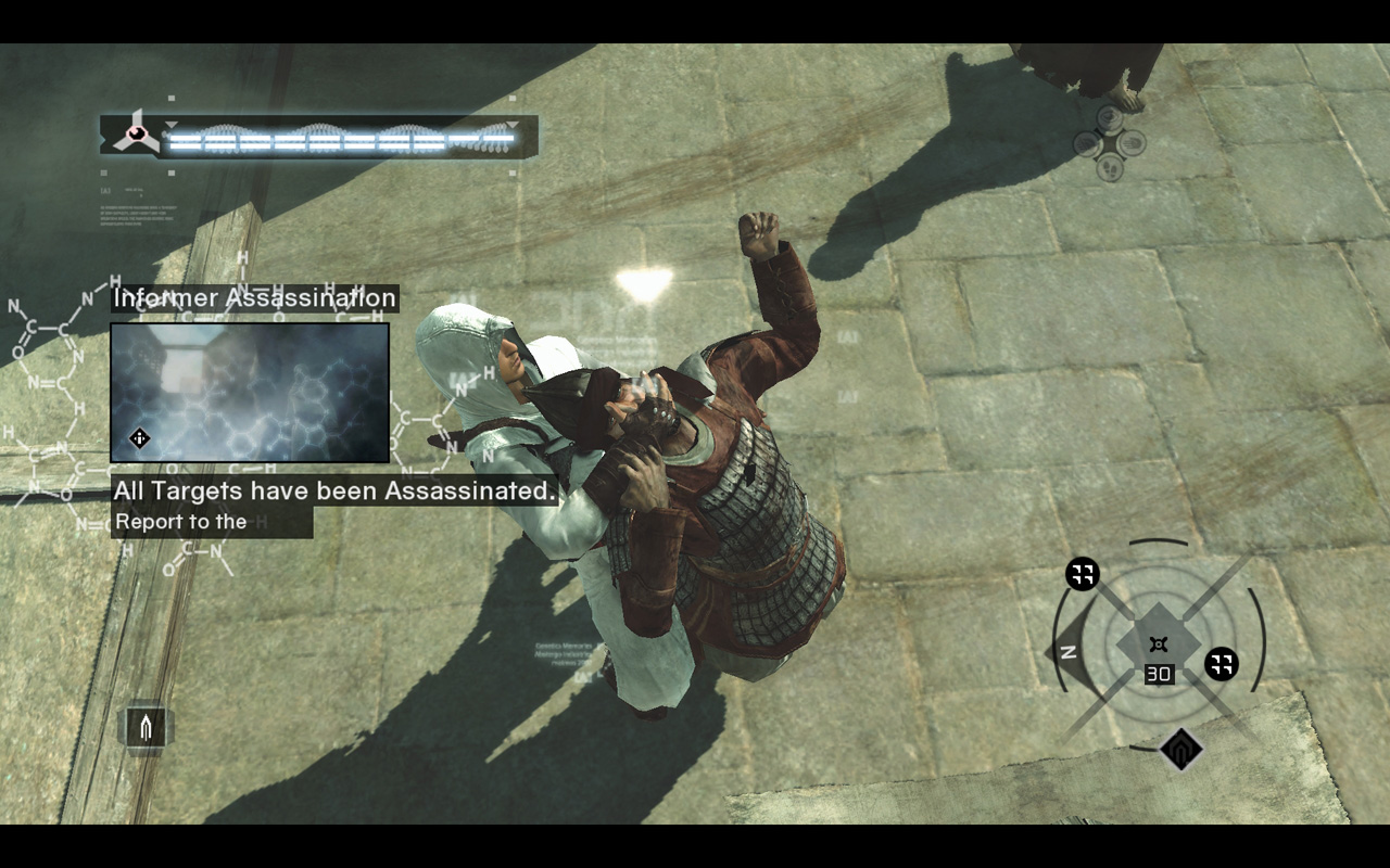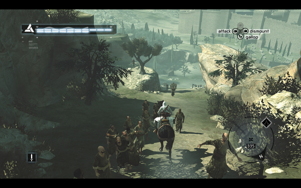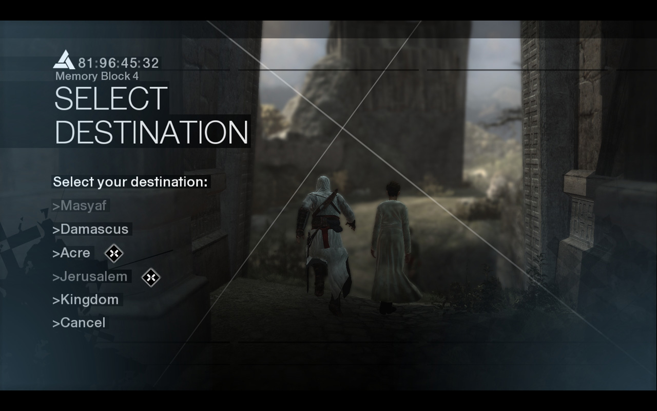 ちなみに,一人暗殺するごとに自動的にマシャフに戻り,大導師アル・ムアリムへ報告するのはご存じのとおり。また,マシャフから一度行ったことのある都市へは,キングダムを経由することなくジャンプできるようになる。これはメチャクチャ楽ちんだが,選択画面でキングダムも選択できるため,馬(もしくは徒歩)で行きたい人はそちらをどうぞ。途中,いろいろなものもあることだし,馬,楽しいし。