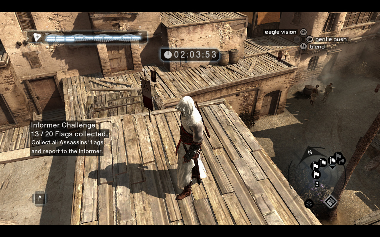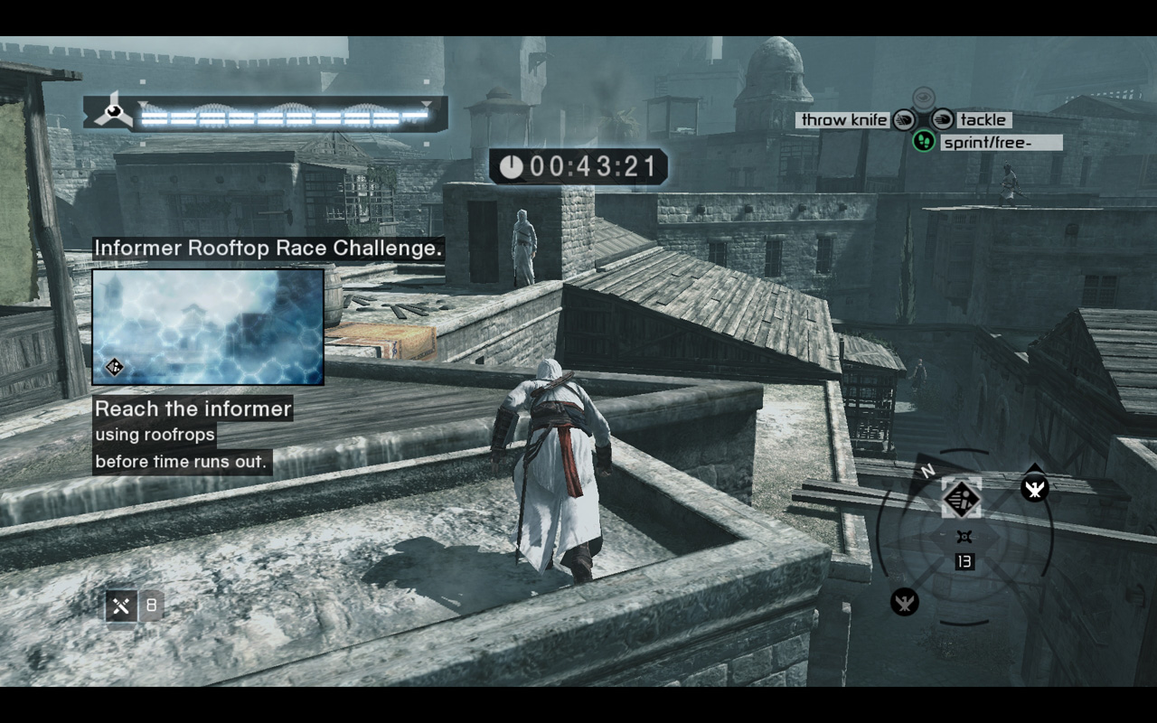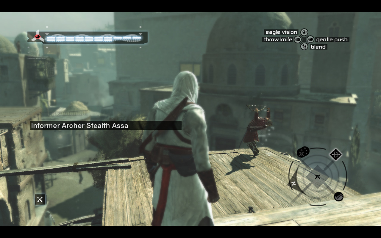 弓兵の暗殺 基本的に暗殺任務と同じで,警戒レベルが最高になると任務失敗だ。弓兵の暗殺ということから分かるとおり,ターゲットは屋上にいて周辺を警戒するように移動している。投げナイフが効果てきめん |