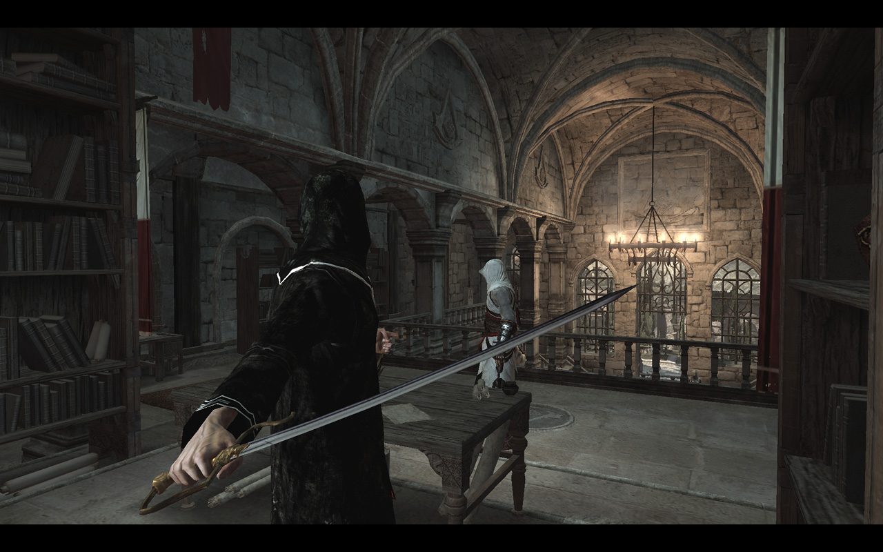 モンフェラート侯ウィリアムへのもとへは屋根づたいに進んで迫る。部屋の上まで来たら様子をうかがい,スキを見て背後からサクリというのがベストだろう。もし,失敗しても冷静に剣で戦えばよいのだ。