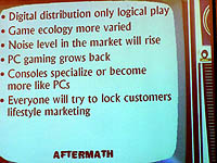 今回の講義でも語られていたが,デジタル・ディストリビューションやWeb2.0的なユーザー参加型のシステムに,現在の流通モデルは当てはまらない。すなわち,開発者ばかりでなくゲーム産業そのものが変革を迎えるときに来ているのかも知れない。(ライター:奥谷海人)