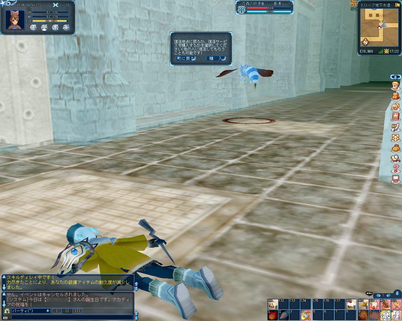 難易度は高くない,などと書いておきながら,スクリーンショット撮影に必死で,初戦はうっかり戦闘不能に。こうなるとデスペナルティとして,装備しているアイテムの耐久度が大きく減ってしまう