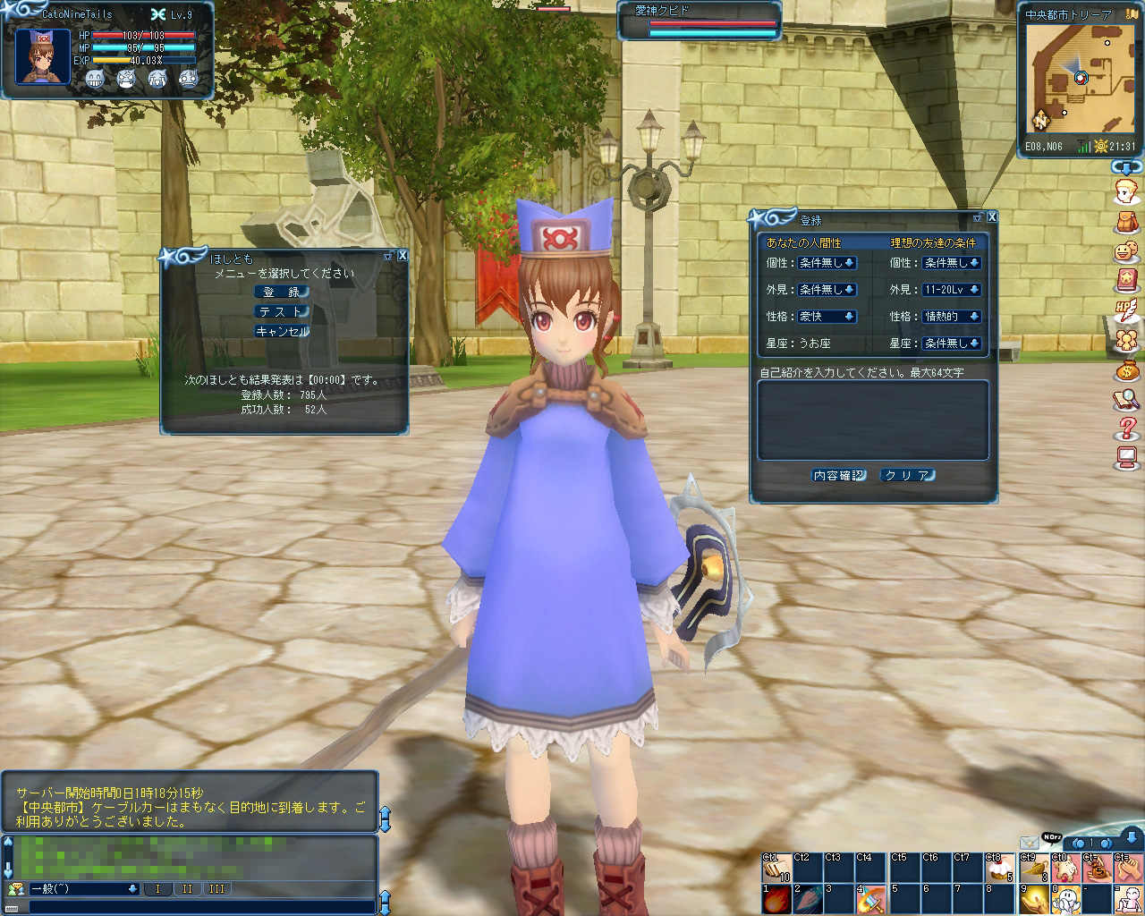 なにはともあれ,ほしともを探すためには,まず「愛神クピド」のところへ行き,キャラクター情報を登録しなければならない。登録する情報は「あなたの人間性」と「理想の友達の条件」に分かれており,それぞれ「個性」「外見」「性格」「星座」の4種類……って,これじゃまるっきりお見合いじゃない!? ゲーム内のベストパートナーを探すのだから,てっきりキャラクターレベルや「ファイター/メイジ系」などのクラス,主なプレイ時間帯といった情報を登録するのかと予想していたのに,これはまさに履歴書&釣書。筆者が求めていた“友達から始まる爽やかなお付き合い”というより,外見だの性格だの,やけにリアリティのある情報を求められている。これで顔写真の提出を求められたら完璧だ。