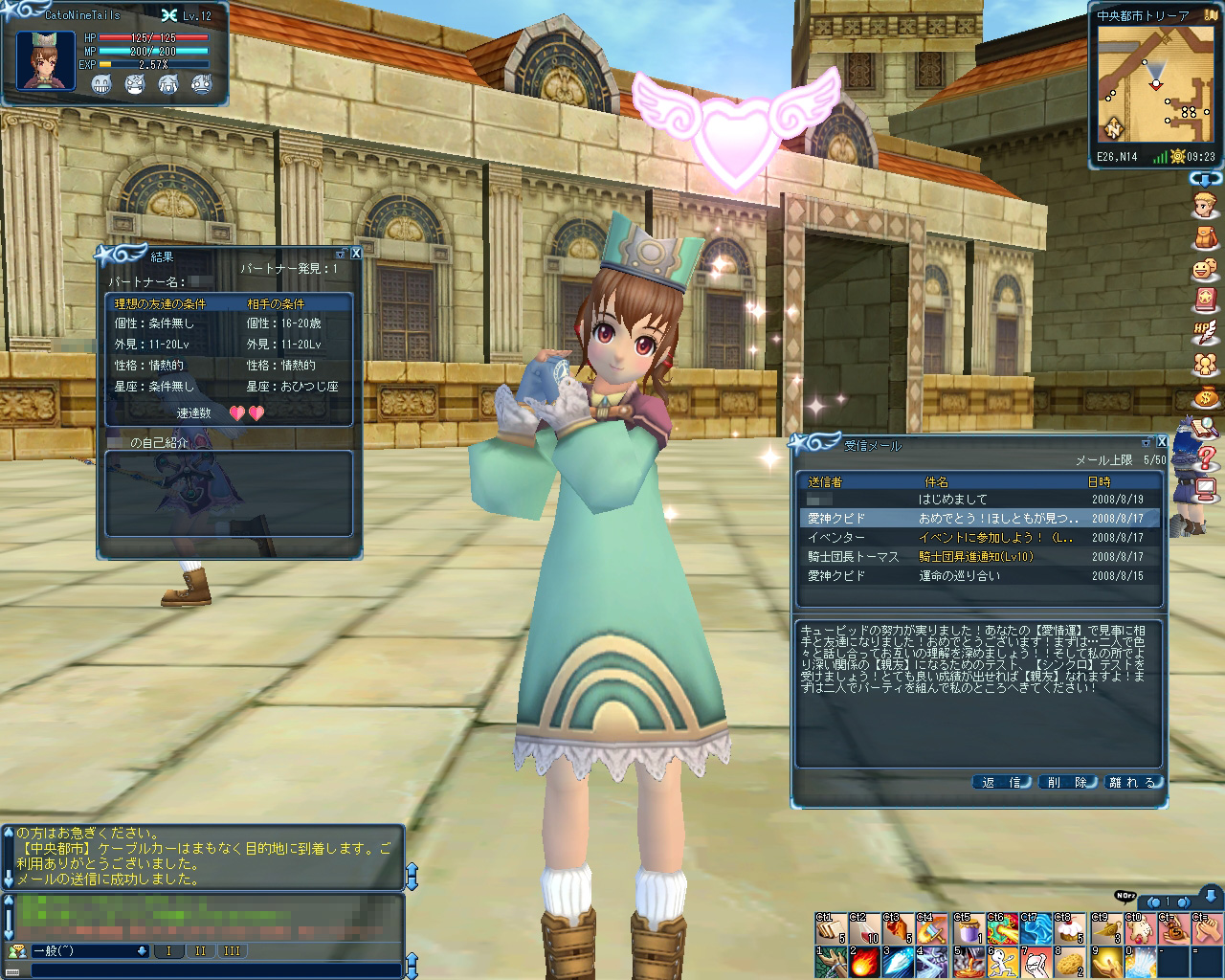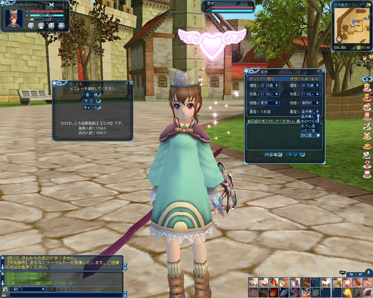冒頭からいきなりで大変申し訳ないのだが,今週のCatoNineTailsはとても落ち込んでいる。転職から生産スキルによる洋服作りを始め,ルーセントハートの魅力を読者に伝えるべく,3週にわたり頑張ってきのだが,ここにきて大きな挫折を味わうハメになったのだ。彼女を泣かせたのは,「ほしとも」を探す「キューピッドシステム」である。