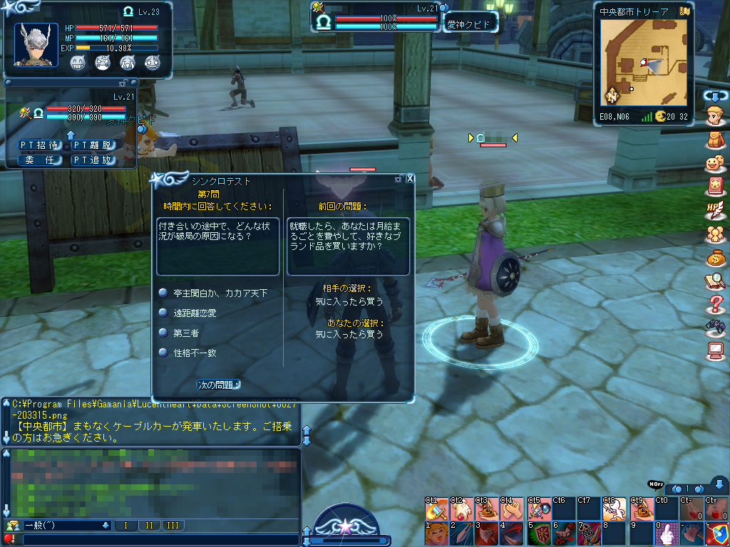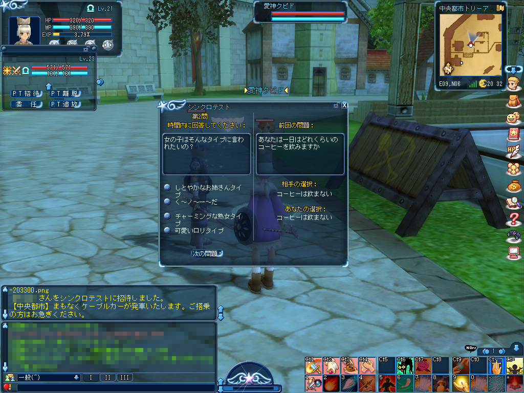 ほしとも候補が見つかるとキャラクターの頭上にピンクのハートマークが舞い,クピドがわざわざメールでお知らせしてくれる。ほしともリストのウィンドウを開くと,相手の血液型やレベルなどの細かい情報もチェック可能だ。しかし,これだけでキューピッドシステムは終わりではない。相手がログインしているなら,とりあえず連絡を取って二人でクピドのところへ行こう。次なる試練「シンクロテスト」が待っている。シンクロテストはその名の通り,二人の相性を確かめ,高めていくもので,同じ質問に対する二人の答えでシンクロ率がはじき出される。これを数回繰り返せば新密度が高まり,やがては「親友」という関係になれる。