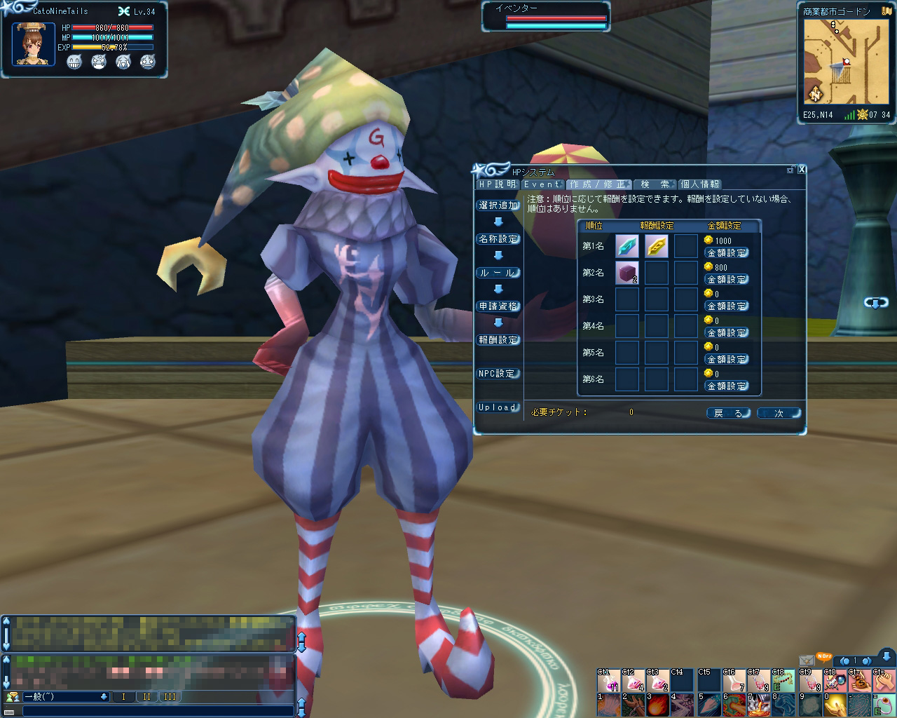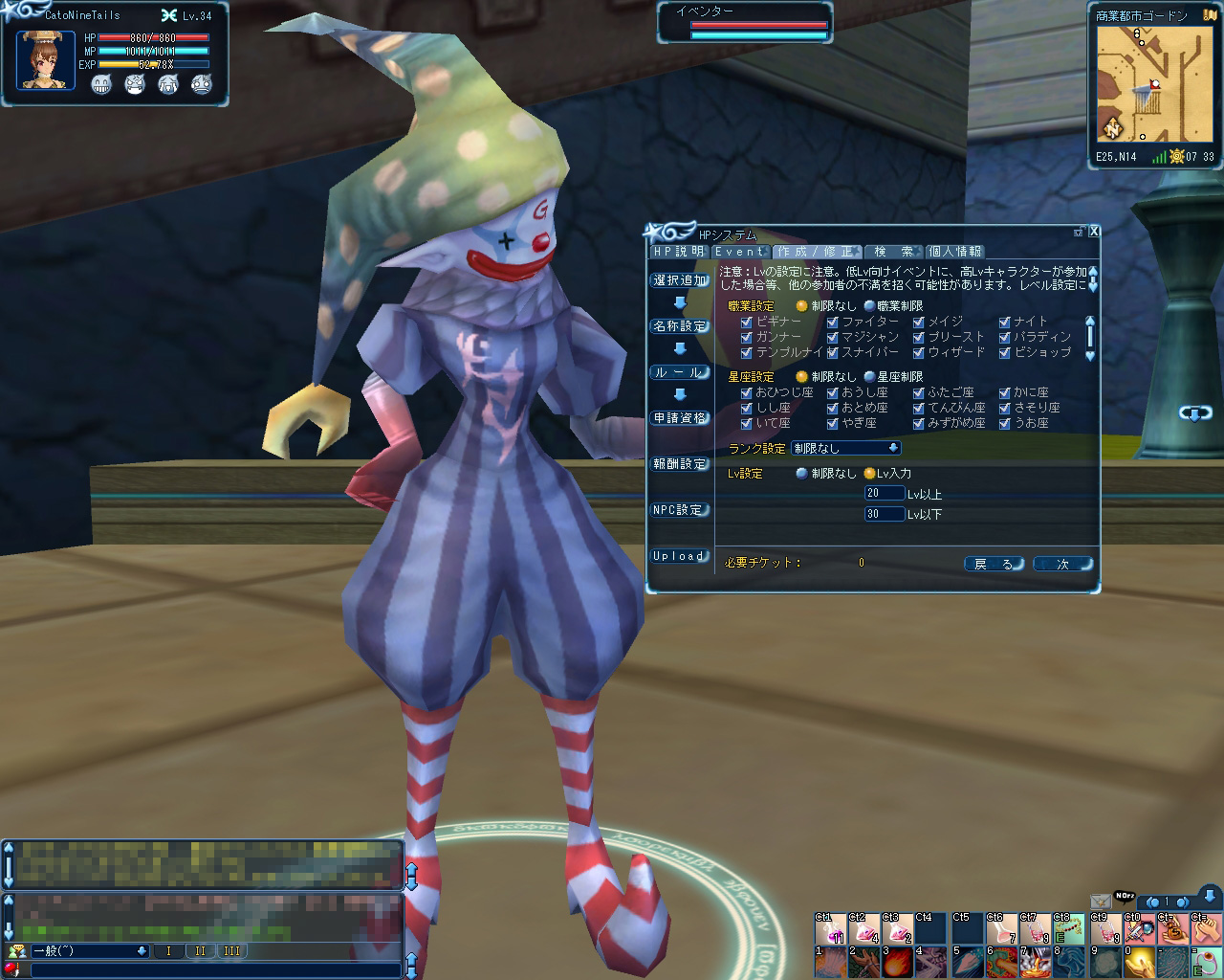 まずはクエストを作成,提供する方法だが,「Hキー」を押してHPシステムのウィンドウを開き,「作成/修正」タブを選択。イベントの開始と終了時間,イベントの名前,イベンターNPCを立てる位置,参加者が集めなければいけないアイテムといった基本事項に加え,参加者のレベルや職業,星座などの制限を順番に指定していくだけで簡単に作れてしまう。もちろんイベント主催者は賞品や賞金を設定しなければいけないのだが,プレイヤーは参加したイベントに対して評価ポイントをつけられる。評価ポイントを溜めることで,ハッピーパイロットレベルが上昇。レベルによって参加人数を増やせたり,より複雑な内容のイベントが設定できるシステムゆえに,労力に見合わない報酬を設定するようなイベント主催者は少ないようだ。