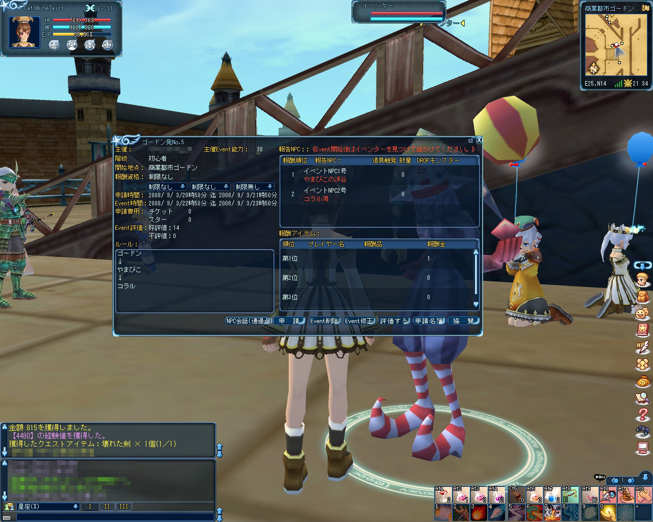 逆にイベントを楽しみたいプレイヤーは,同じく「Hキー」の「Event」タブで,今日登録されているイベント一覧をチェック。時間帯や内容,自分のキャラクターのレベルなどを考えて,参加したいイベントを選び「申請」ボタンを押すだけだ。開始時間になると画面上に「イベント開始」の文字が表示される。あとは話しかけるNPCのところへ移動したり,指定されたアイテムを集めればいい。イベント名が「話すだけ」となっているのは,指定した位置にいるNPCに話しかければ経験値や賞金がもらえる,一番簡単なタイプだ。試しに一つ参加してみたところ,狩りをしながらのんびり3位入賞で,約1万5000ポイントもの経験値がもらえてしまった。ソロプレイが多く,キャラクターのレベルが伸び悩んでいる人ほど,HPシステムは積極的に参加してみてほしい。