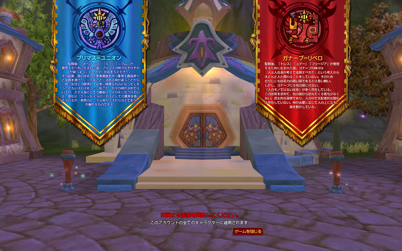 両国家は対立しており,互いの住人同士が遭遇するのはしばらく先のことになるので,友人や知人と一緒にプレイしたい人は,同じサーバーと国家を選ぶようにしよう。