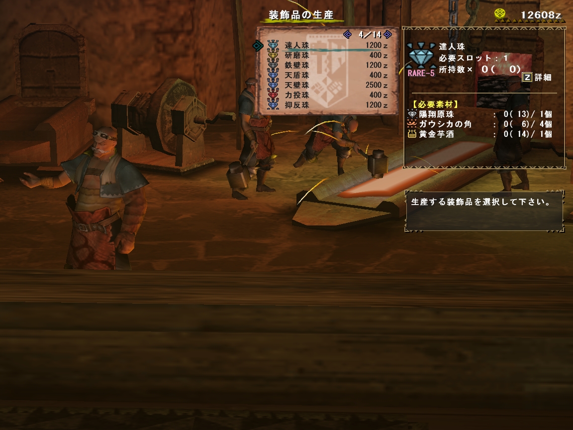 スキルを発動させるために防具を揃えると,どのようにパーツを組み合わせても,追加スキルやもう一段階上のスキルを発動させるのに,ちょっとだけポイントが足りないケースが出てくるだろう。そんな場合に活用したいのが「装飾品」だ。装飾品は,武器/防具のスロットに装着して各種スキルポイントを付加するというもので,武器/防具同様にクエストで入手した素材を使って生産する。