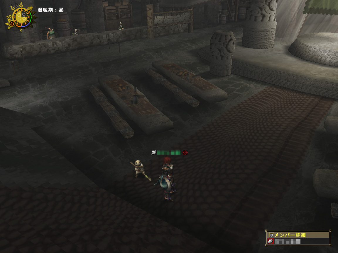 さて,アリーナにはステージが設置されており,夜は歌姫が自慢の“唄”を披露している。もしクエストの報酬として「精霊へ歌う唄」「生命に捧ぐ唄」などのアイテムを入手しているなら,ステージ脇のアイルーと話せば,歌姫にリクエストすることも可能だ。なお,筆者は未確認なのだが,MHFでも過去のモンスターハンターシリーズ同様,歌姫へのリクエストによってポイントが溜まり,50ポイントに達すると「龍頭琴」と呼ばれる水属性の弓が手に入るらしい。