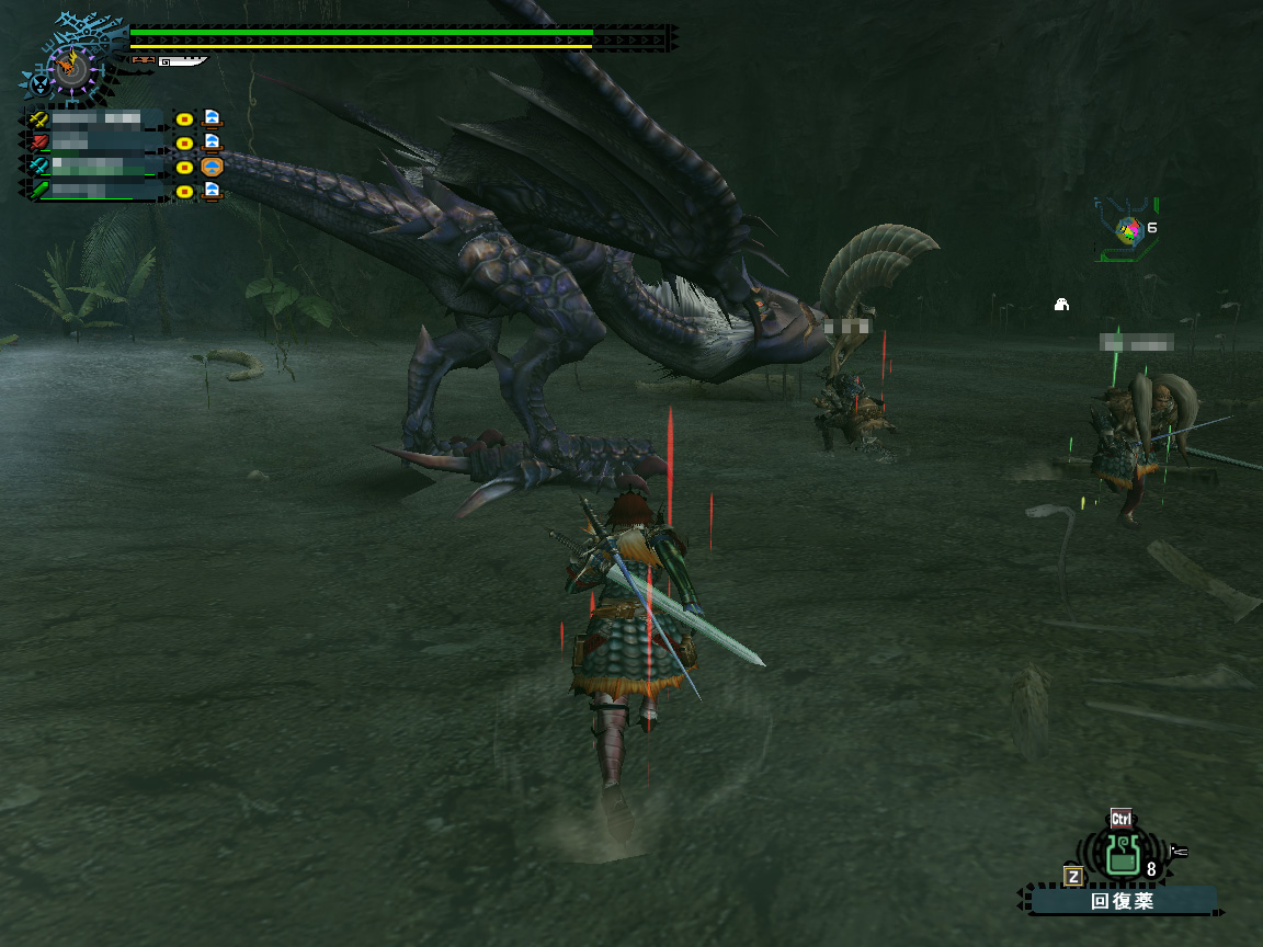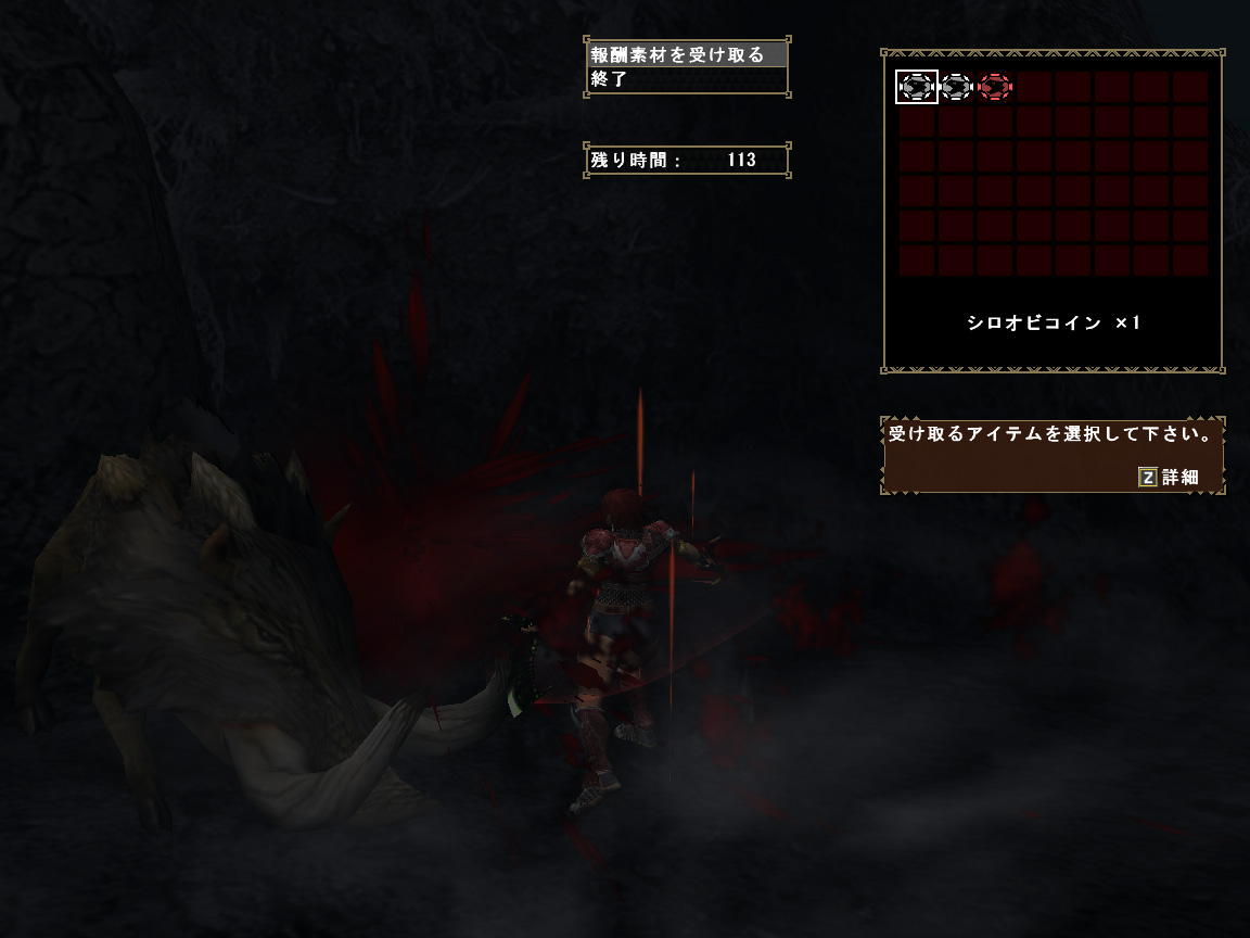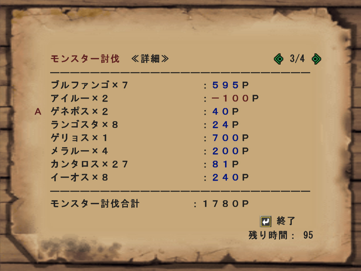 狩猟演習は,メインターゲット一つとサブターゲット二つが用意されている点は通常のクエストと同じだが,メインターゲットの達成は必須で,サブターゲットだけでクリアはできない。メイン/サブターゲット以外にも加点要素および減点要素が細かく設定されており,行動が細かく採点される。基本的には,好戦的なモンスター(大型含む)を倒す(部位破壊する)と加点,回復アイテムを使ったり非好戦的な一部モンスターを倒したりすると減点されるという仕組みだ。