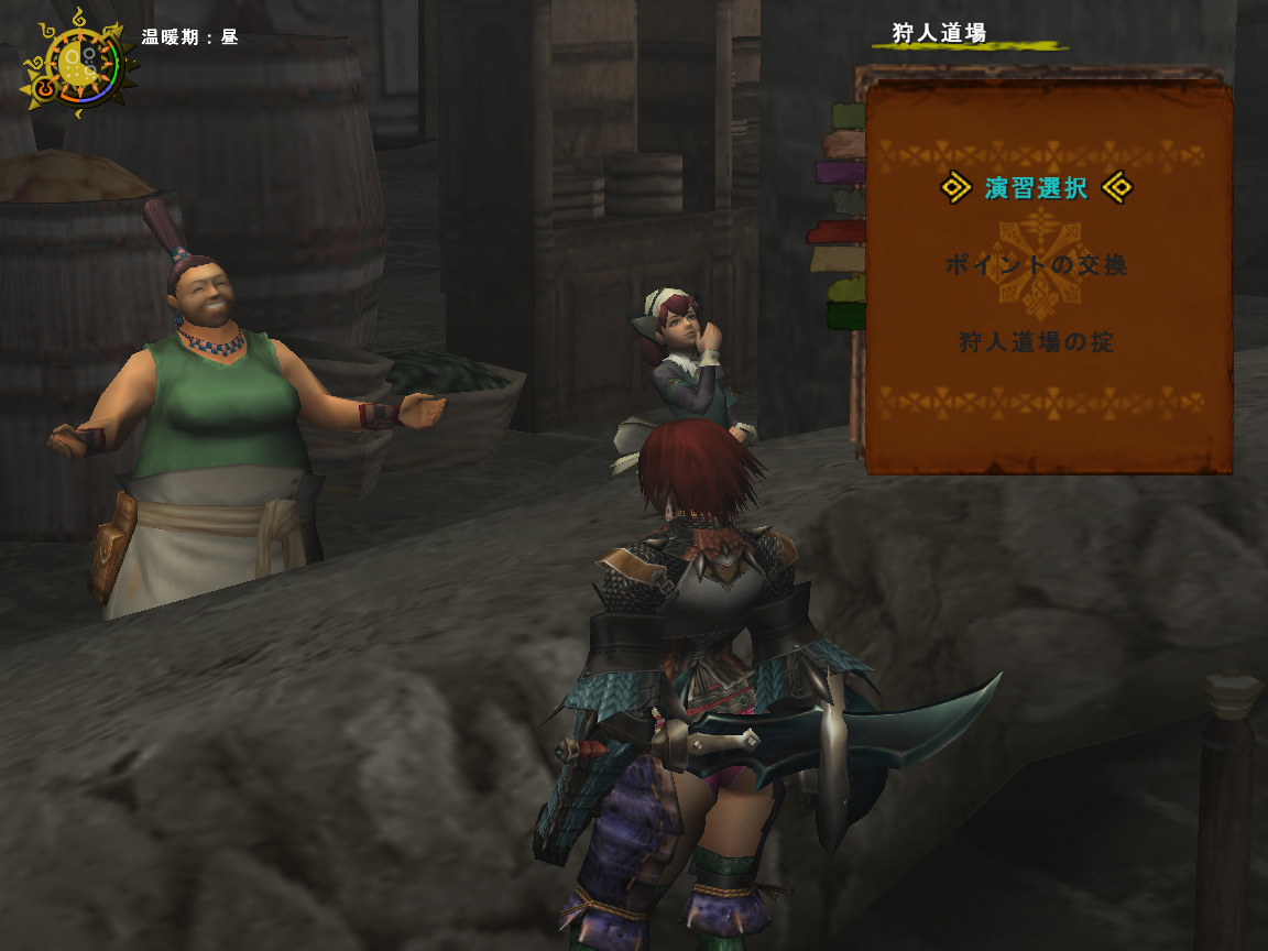 闘技演習も基本ルールは狩猟演習と同じだが,こちらはハンターランク11以上にならないとプレイできない。最初に選べるのは一つだけで,クリアするごとに次の演習が追加されていく。簡単なものから順に,ドスランポス2頭,ゲリョス,リオレイアの討伐となる。また,ハンターランク17でショウグンギザミ,同31でディアブロス2頭の討伐が追加され,計5種類のクエストを受けられる。なお闘技演習では,舞台は闘技場/大闘技場となるため,ターゲット以外のザコモンスターは登場しない。