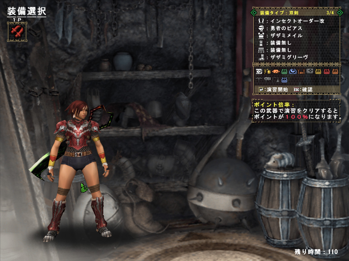 また,いずれの演習も装備/アイテムともにクエストごとに指定されており,自前の装備/アイテムは持ち込めない。クエストごとに指定された武器/防具とアイテムを使うことになるのだが,あらかじめ用意された4種類の中から選ぶことになる。例えば,対ゲリョス演習では弓とライトボウガン,対リオレイア演習にはハンマーと狩猟笛しか用意されていない。自分が普段使っている武器以外を使いこなす必要が出てくるのだ。
