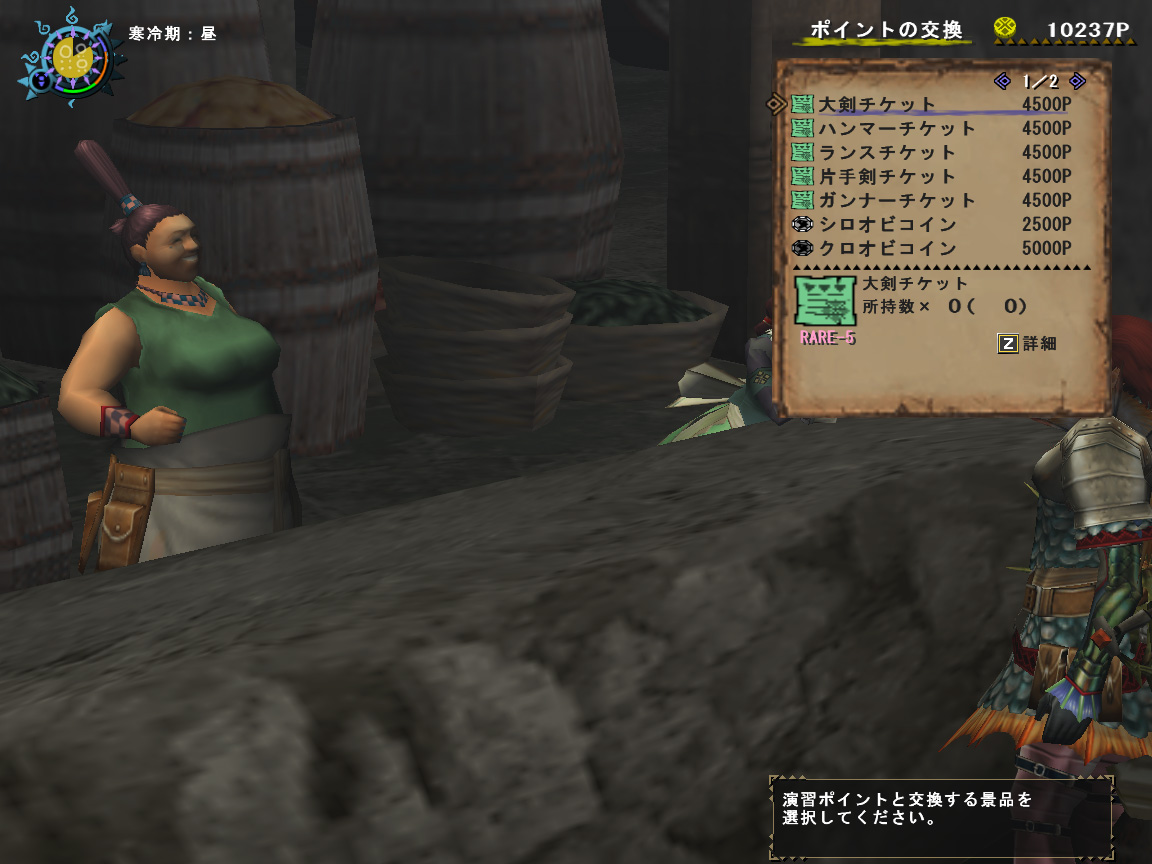演習をクリアして得られる演習ポイントは,“武器チケット”や“コイン”各種と交換可能だ。また演習中に狩猟したモンスターに応じて,“飛龍のコイン”“魚竜のコイン”といった報酬を得られる場合もある。こうしたチケットやコインは,いずれも特殊な武器/防具の素材となる。これらの素材から生産できる装備は,外見に大きな特徴があるため,他人とはちょっと違ったファッションを楽しみたいという人にはお勧めだ。