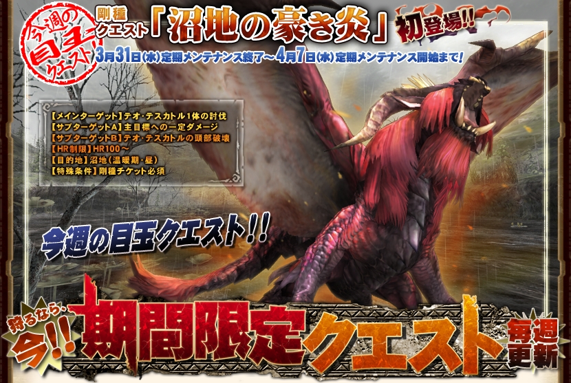 寒さ忘れる豪炎!「MHF」沼地に出現したテオ・テスカトルを狩ろう