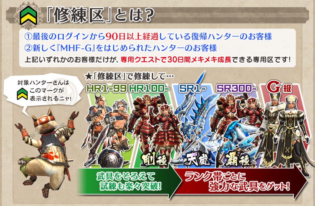 「MHF-G」復帰ハンターのための「修練区」の実装記念イベントを本日より開催