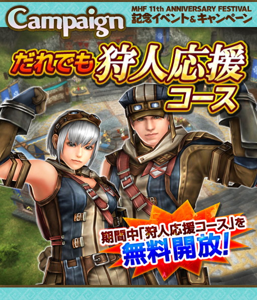『モンスターハンター フロンティアZ』では今週、豪華オプションコースである「狩人応援コース」を無料開放中!また、11周年を記念したたくさんのイベント・キャンペーンも開催中です。