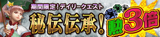 デイリークエスト「秘伝伝承!勲3倍」「秘伝継承!綬3倍」を配信!期間中は、秘伝防具の強化に使用する武器勲・綬が通常時の3倍獲得できます。毎日ログインして大量入手しよう!